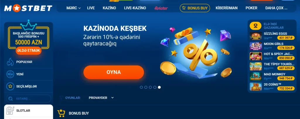 Mostbet kazino hissəsində bonus sistemi müxtəlif oyunçu kateqoriyalarına uyğun hazırlanıb. Yeni istifadəçilər üçün xoş gəlmisiniz paketi, daimi müştərilər üçün keşbek, VIP oyunçular üçün isə digər eksklüziv təkliflər mövcuddur. Bonusların əsas məqsədi oyunçuları uzunmüddətli olaraq platformada saxlamaq və daha çox oyun imkanı təqdim etməkdir.